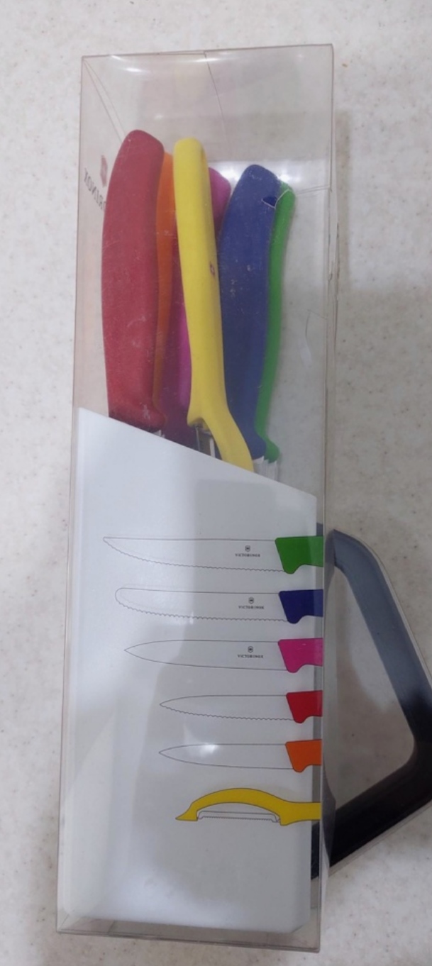 Набор - женская мечта. Выглядит веселенько, впишется в интерьер любой кухни и укомплектован отлично. И с гладкой, и с рельефной заточкой, и овощерезка. Купила себе и полтора года уже радуюсь.