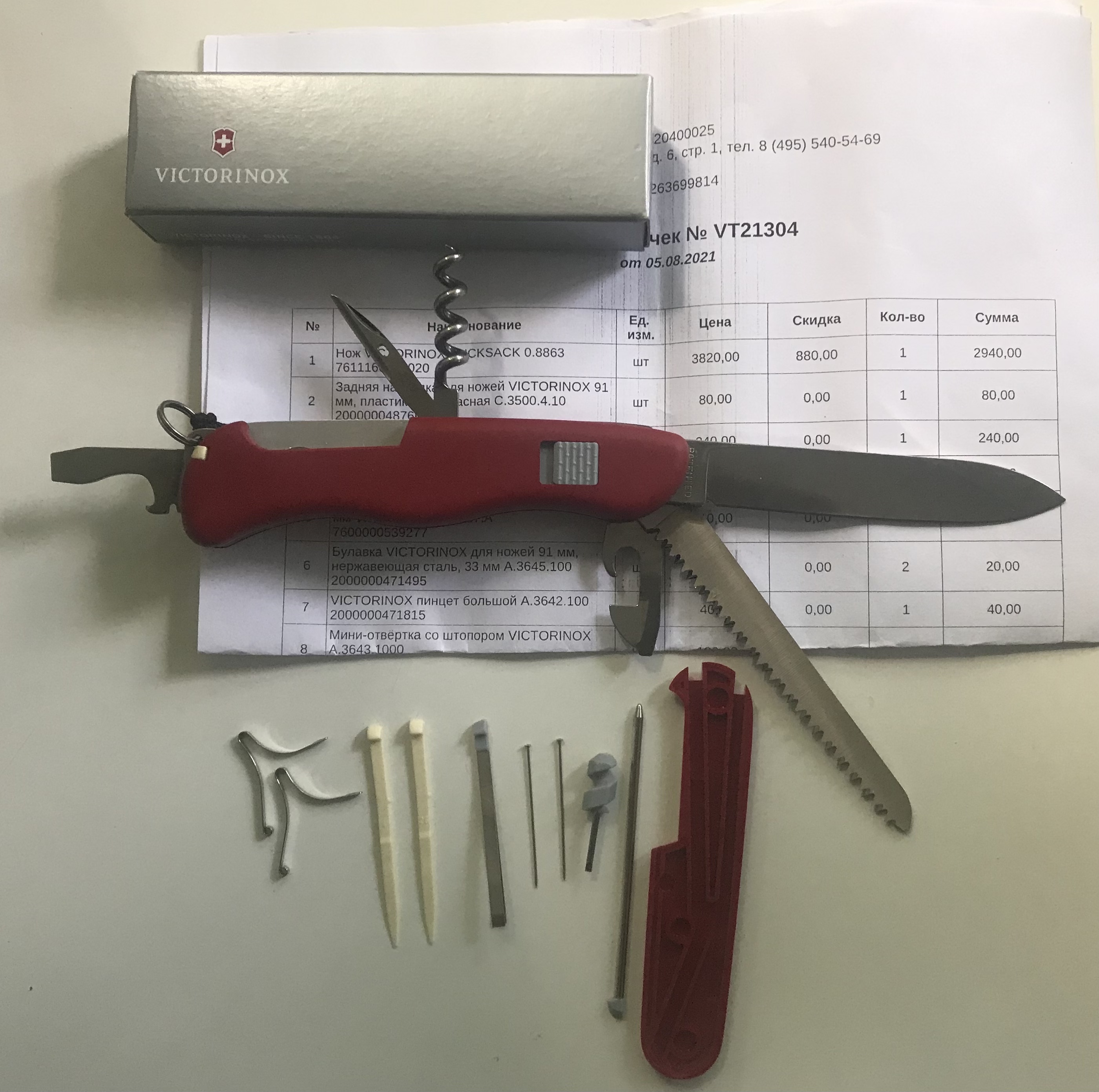 Большое спасибо за грамотный и четкий подбор заказа. Всё началось с того, что мне захотелось заменить заднюю накладку у Victorinox Ranger 91 на накладку с шариковой ручкой. Пока искал, мне попался на глаза Victorinox Rucksack, великолепный нож для леса, пикника с фиксатором и пилой, да ещё и с хорошей скидкой. К нему ещё конечно же заказал мини отвертку. Друг попросил сломанную пружину для ножниц подкупить. Заказал и ему и себе про запас. И так по мелочи: две зубочистки, две булавки (швейные булавки по 0,7мм,а фирменные по 0,8) и пинцет. Ничего не перепутали. Молодцы! Спасибо!